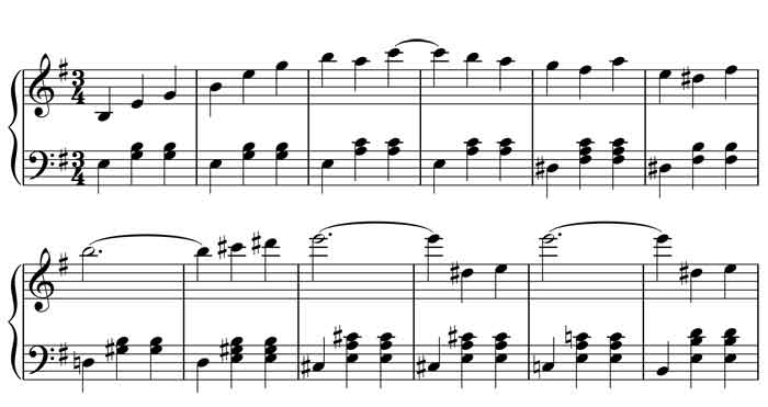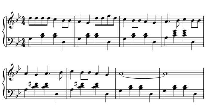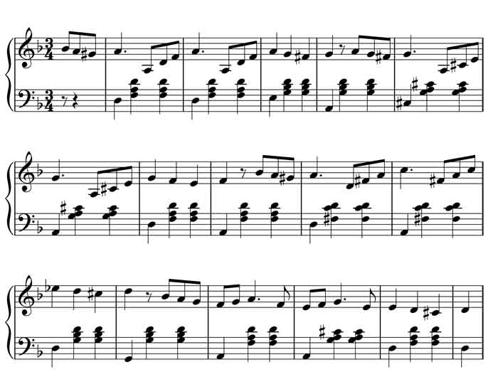 The lament-like quality of these themes is evident in their minor key and bass line. Notice especially in both of the examples above that the bass steps down in semitones from the tonic to the dominant over the two lines shown. (They actually have exactly the same chordal structure). In classical music, this is known as the “lament” bass line because it is associated with the expression of deep grief, the best-known example being “Dido’s Lament” from Purcell’s opera Dido and Aeneas: