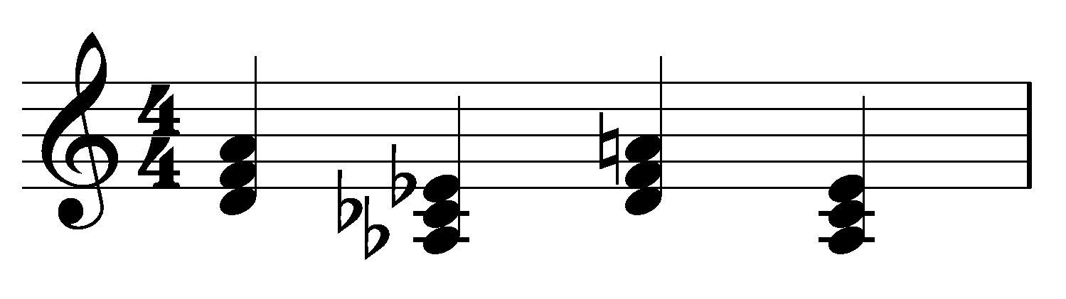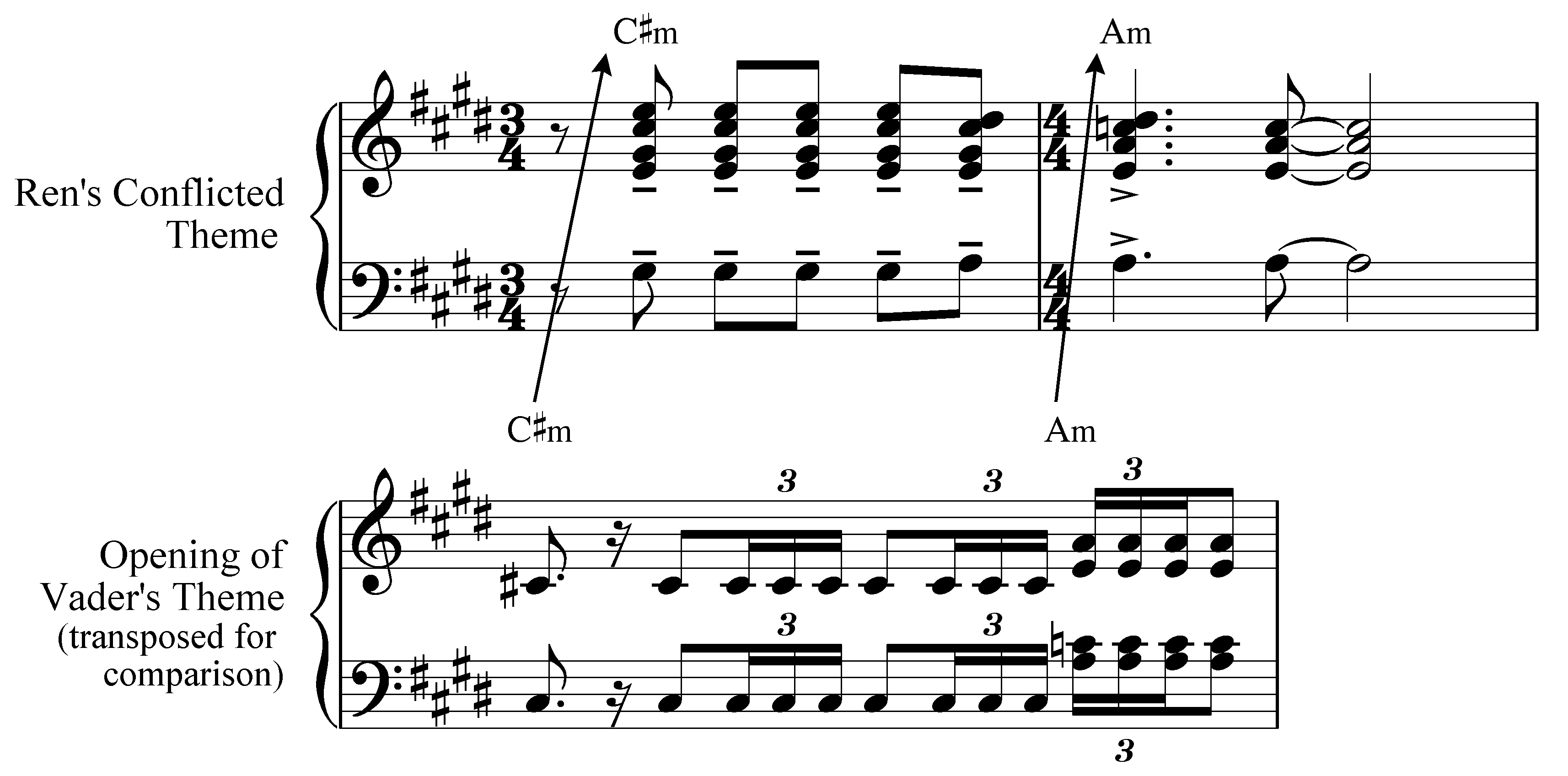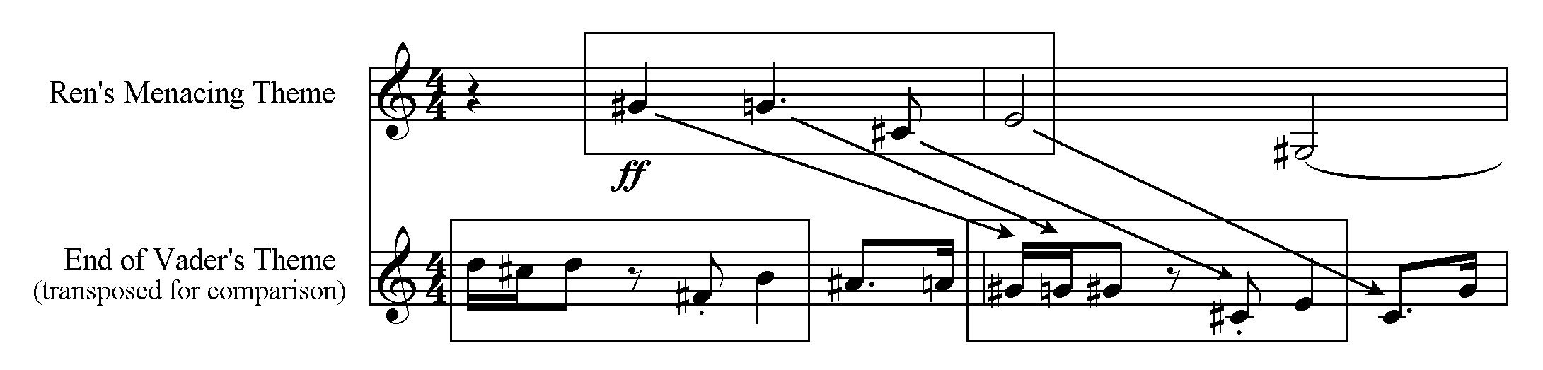 This theme is a short, repeated motif that can be heard as distantly related to the second half of Vader’s theme, as shown by the boxed portions below. (The arrows show a closer relation through the particular notes in the chord.) It is heard in most scenes where he is approaching to threaten, harm, or attempt to bring opponents under his control.