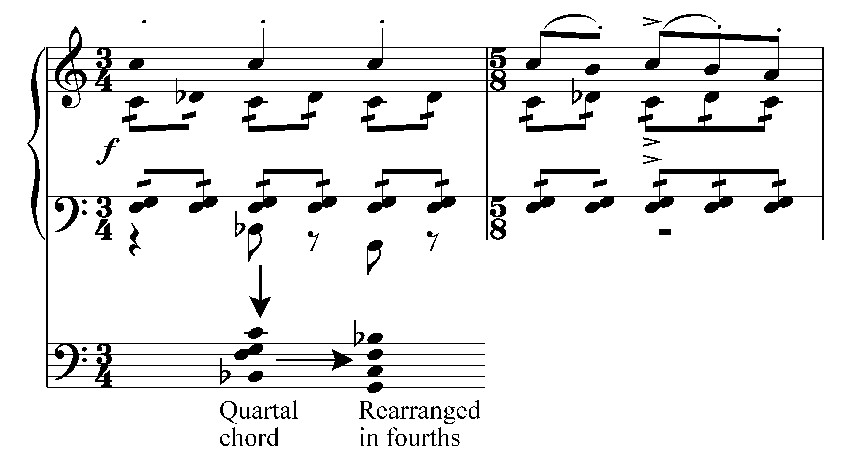 Quartal harmony describes chords that are built from stacking intervals of fourths rather than thirds. Despite their differing construction, quartal chords of three or four notes have all but one of their notes in common with third-based (or tertian) chords. And curiously, the one different note can be any of a quartal chord’s notes. As a result, when placed in a context where there is no clear tonic, as here, quartal chords sound like tonal harmony in which the tonal center has been obscured. In other words, there is a fundamental instability to quartal chords that render them suitable for action music. They also lack the biting dissonance of semitones and tritones in this case, which gives a lighter feel that supports the moments of levity Finn inserts into these scenes.