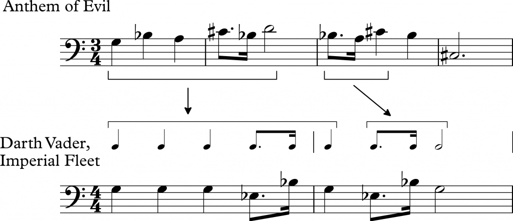 Finally, the Anthem of Evil also has a rhythmic resemblance to Darth Vader’s theme, the Imperial March (see below). This allusion is more hidden for two reasons. First, the sixth note is given a longer length before the theme continues the Vader rhythm where it left off. Second, the rhythm is set in an off-balance and somewhat ambiguous 3 beats to a bar instead of a steady march of 4 to a bar, suggesting the distorted nature of the evildoers in this film as they conspire together or channel the past evils of Vader or the Imperial fleet.