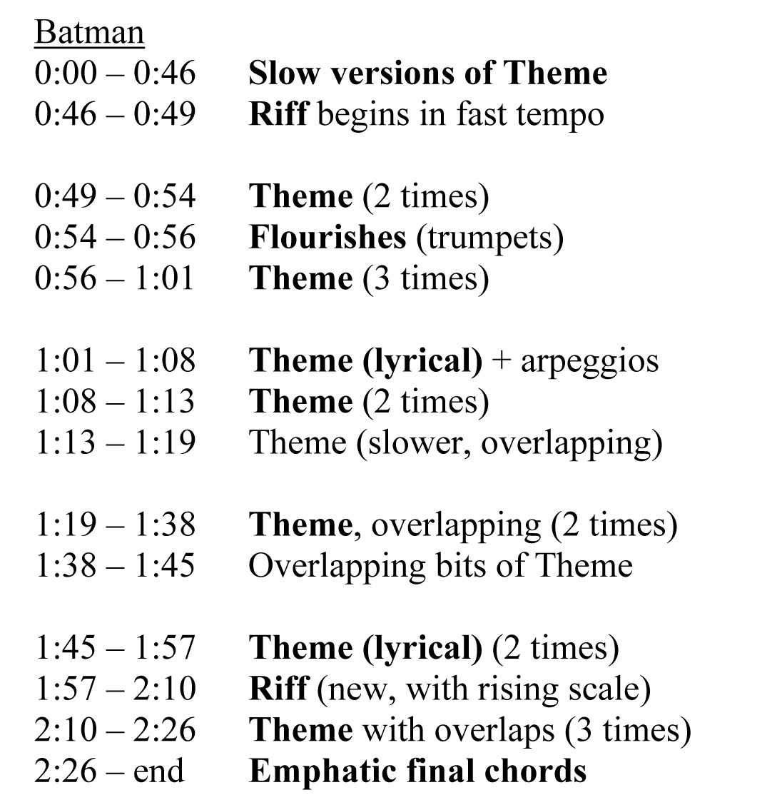 The second part of section 4 in each is contrasting in that it is not another full statement of the theme, but something else. In The Simpsons, this is where we see Maggie “driving” the car to a cute little tune for glockenspiel and pizzicato strings. In Batman, there are fragments of the theme repeated and overlapping with one another.