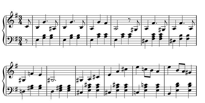 000019---Lament-2The lament-like quality of these themes is evident in their minor key and bass line. Notice especially in both of the examples above that the bass steps down in semitones from the tonic to the dominant over the two lines shown. (They actually have exactly the same chordal structure). In classical music, this is known as the “lament” bass line because it is associated with the expression of deep grief, the best-known example being “Dido’s Lament” from Purcell’s opera Dido and Aeneas: